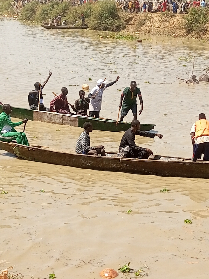The image depicts a crowded water scene in Kokani North, Nigeria, featuring multiple individuals in wooden dugout canoes on murky brown water