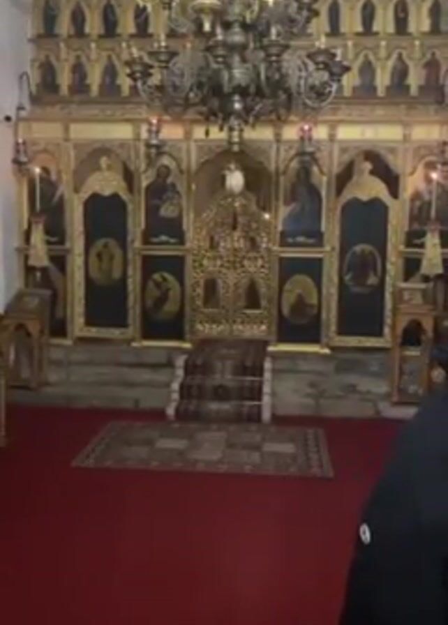 interior of a church. A large, ornate golden altar is visible at the front of the church. A person wearing a dark jacket is partially visible on the right side of the frame. A large chandelier hangs from the ceiling. The floor is covered with a red carpet. The overall lighting in the church is dim.