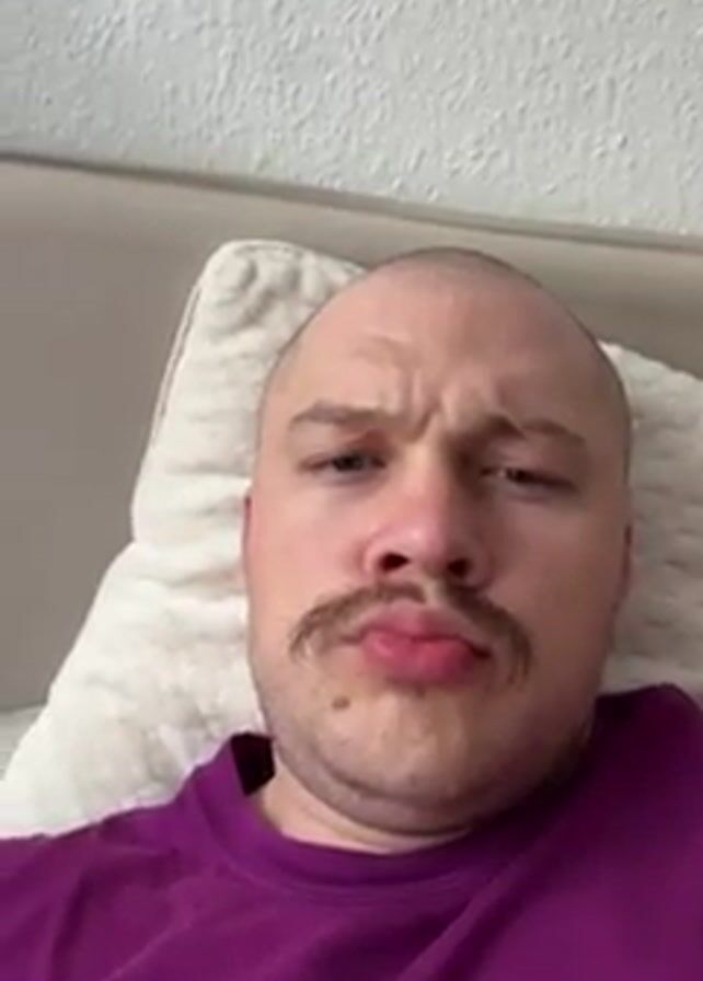 A person with a shaved head and a mustache, wearing a purple t-shirt, is lying on a bed against a white pillow