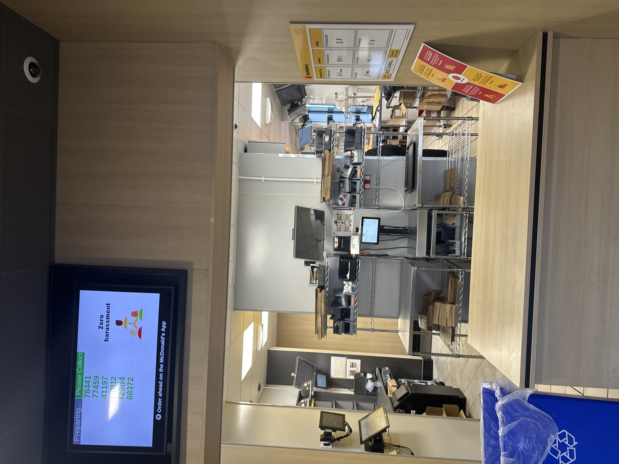 The image depicts the interior of a McDonald's restaurant, likely the area where orders are prepared and collected