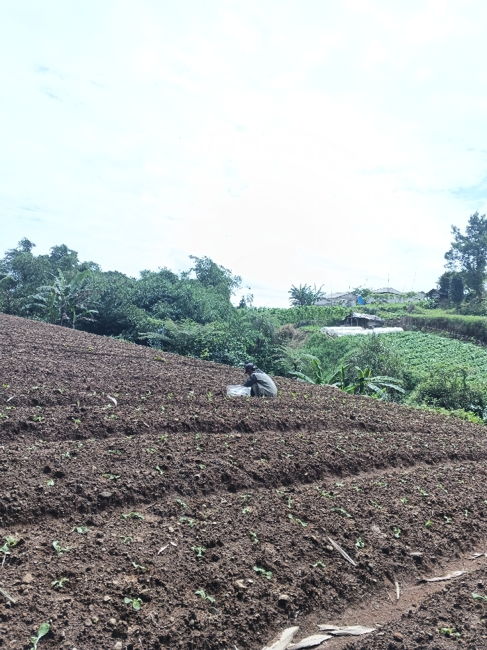 A person in dark clothing kneels amidst rows of planted crops on a sloping, brown field. Vegetation and trees form a backdrop to the field, with a few buildings visible in the distance. The sky is partly cloudy, adding brightness to the outdoor scene.