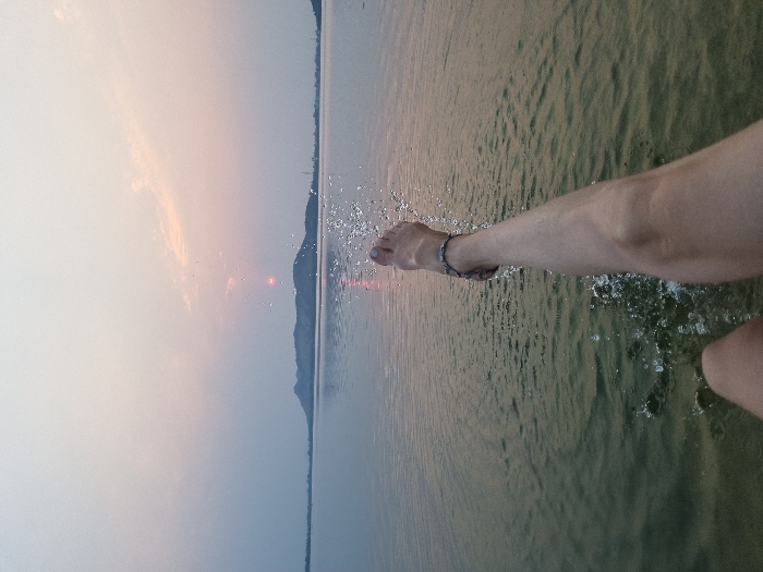 The scene, located in the vicinity of Kammavaripalli, India, depicts a large body of water at sunset. A human leg, bare from the upper thigh down to the foot, extends into the water from the lower right of the frame. The foot is submerged, and an anklet is present on the ankle. Numerous water droplets are actively splashing around the foot, indicating recent movement within the water. The water surface is generally calm, with reflections of the sky, appearing murky green-brown in the foreground and transitioning to blue-grey towards the horizon. Across the water, a range of dark, undulating hills is visible spanning the horizon line. A small, reddish-orange sun disc is positioned low on the horizon, reflecting faintly on the water directly below it. The sky exhibits a gradient of pale blue, pink, and orange hues, consistent with twilight.