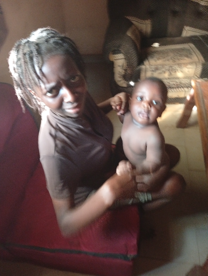 A young woman with braided hair sits on a maroon sofa, holding a baby. The woman wears a brown shirt and looks directly at the camera with a serious expression. The baby is shirtless and has a curious expression. Behind them, a patterned sofa and a wooden table are visible, indicating an indoor setting. The lighting is slightly dim, creating shadows.