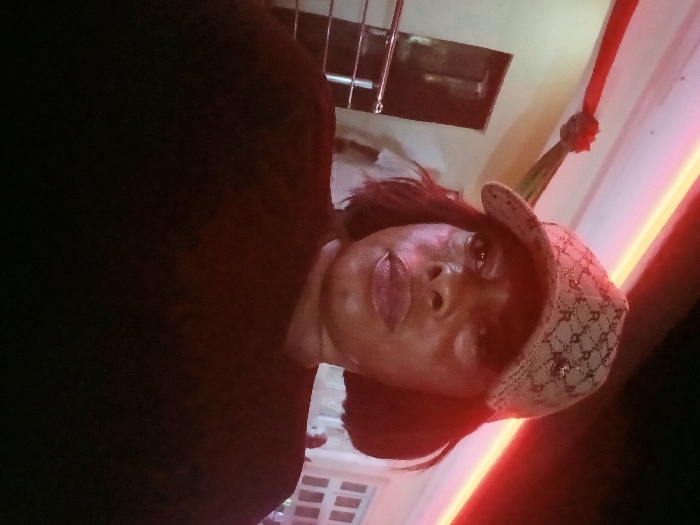 A person wearing a cap stands in a dimly lit room. The lighting includes a neon light source and a red light beam. The person is facing the camera with slightly parted lips, and a part of their hair falls near their shoulder. Elements within the room, such as window frames, are visible. The overall ambiance is dimly lit with pronounced contrasts between light and dark.