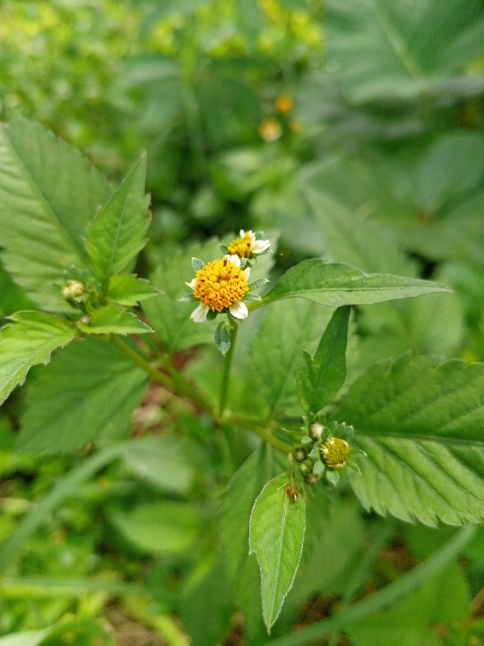 A close-up shot focuses on a vibrant cluster of green foliage. Prominently displayed are leaves, their veins visible, intermingling with small, budding flowers. A singular bloom, a vibrant yellow core surrounded by delicate white petals, catches the eye. Some leaves show minor blemishes. A few more such blooms are visible in the background but are out of focus.