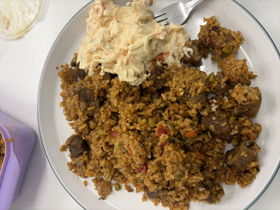 An overhead view captures a meal served on an off-white oval plate. The plate is predominantly filled with a reddish-brown rice dish, containing irregularly shaped chunks of dark meat, green peas, and small red vegetable pieces, consistent with a pilaf or jollof rice. To the right, a distinct portion of creamy coleslaw is present, composed of shredded white and orange vegetables in a thick, light-colored dressing, with visible green specks. A silver-colored metal fork is partially visible on the right side of the plate, resting within the coleslaw and on the plate's edge. In the upper left background, a light purple plastic food storage container is partially visible, showing some food residue on its rim. In the upper right background, a circular white object with faint white residue is discernible on the white surface. The meal is situated on a clean, white, flat surface. This scene is located in the city of New Forest, United Kingdom.