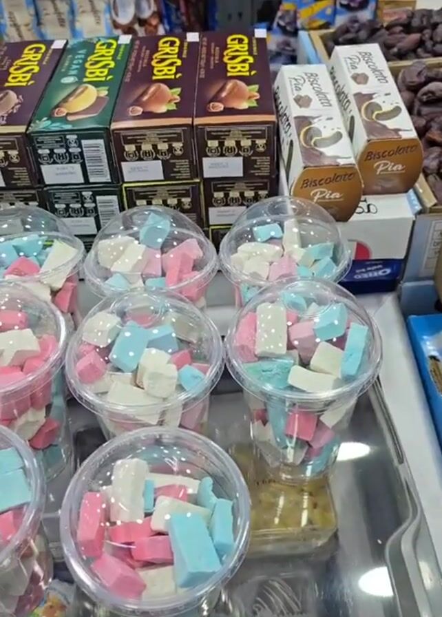 The camera zooms in on a display of clear plastic cups filled with pastel-colored chalk pieces in pink, white, and blue. The cups are arranged on a metallic tray, and behind them, on shelves, are boxes of Grissini and Biscolata Pia snack items. The setting appears to be a retail environment. The shot is stable, and there are no visible people or actions aside from the subtle movement of the camera.