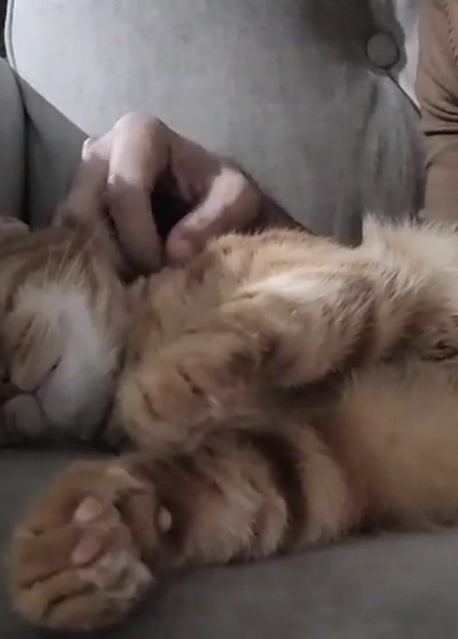 A person is gently stroking a sleeping, orange tabby cat lying on a light grey couch