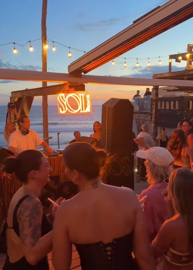 The video captures a vibrant sunset scene at an outdoor beach club where people are dancing and enjoying themselves