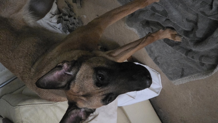 An indoor scene in Magny-les-Hameaux, France, captures a tan and black-muzzled dog, consistent with a Belgian Malinois, positioned diagonally on a light-colored hard floor