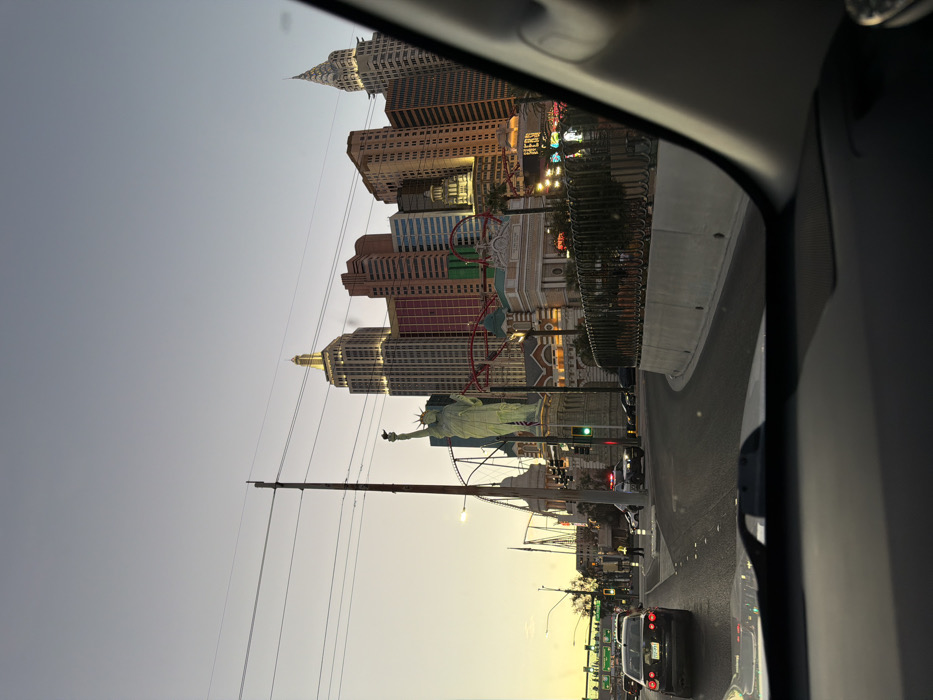 The image displays an urban street scene at dusk or early evening, captured from the interior of a vehicle. The location is the New York-New York Hotel & Casino complex in Paradise, United States of America. The sky exhibits a gradient from a light orange-yellow near the horizon to a muted blue-grey overhead. Artificial lights on buildings, signs, and street fixtures are illuminated. In the immediate foreground, the dark dashboard and lower portion of a windshield are visible, with a reflection of a green traffic light on the glass. A paved multi-lane road, marked with white lines, curves from the left foreground towards the midground. A light-colored concrete barrier topped with a black metal fence separates the road from the casino property. Traffic is present on the road. A dark-colored sedan with illuminated red taillights and a license plate reading "259 P91" is in the left lane. Further down the road, a police cruiser with active red and blue emergency lights is visible. One individual, wearing a high-visibility yellow-green vest, stands near the police vehicle on a median. The background is dominated by the New York-New York Hotel & Casino's distinct architecture, featuring a large replica of the Statue of Liberty and multiple skyscraper replicas, including representations of the Empire State Building and Chrysler Building. A prominent red roller coaster track weaves through and around these structures. Buildings display illuminated windows and architectural details. A colorful sign displaying "HERSH" (likely Hershey's) is visible on a lower building. Utility poles and overhead power lines traverse the upper midground. A green traffic signal is visible below the Statue of Liberty replica.