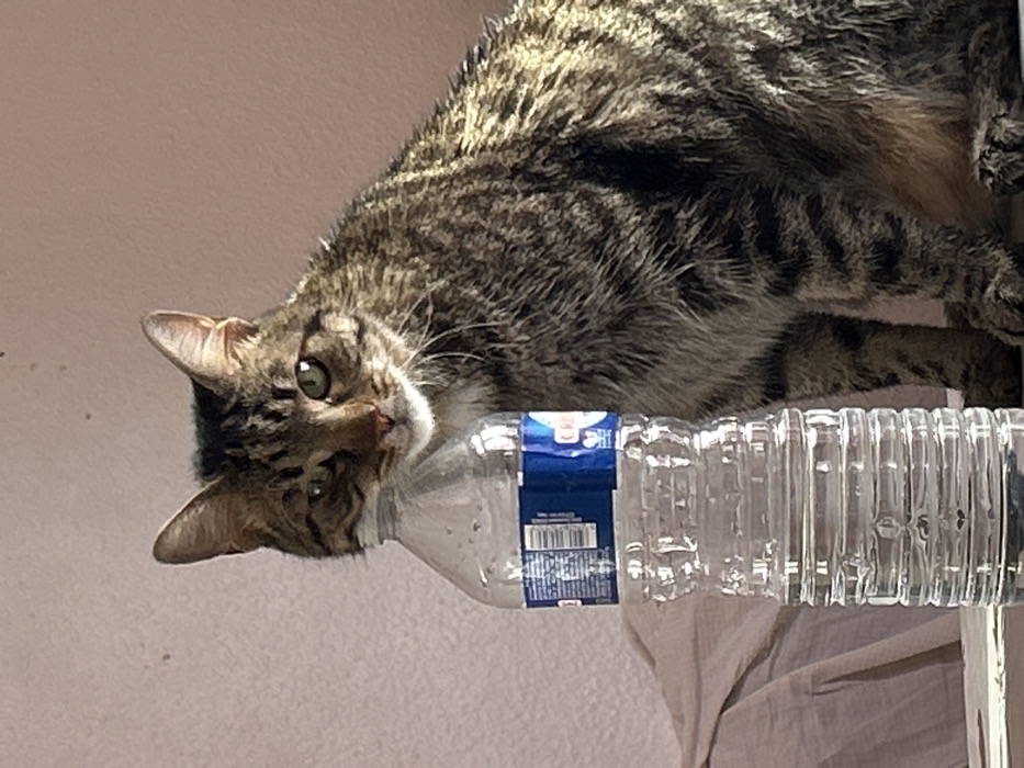 - "A domestic short-haired tabby cat is seated in an indoor setting, positioned next to a clear plastic water bottle" by FM-UV3cT2, licensed under CC BY 4.0