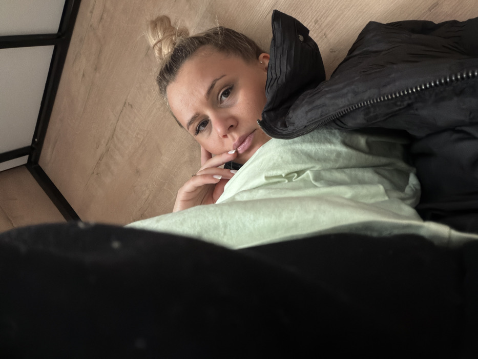 The image captures a low-angle view of a young adult female lying on her back on a light brown, wood-grain patterned floor