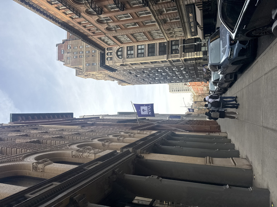 Looking upward, buildings rise on either side of a narrow street. A purple NYU flag hangs from a pole attached to the lower building. Four people stand on the sidewalk next to parked cars. The buildings are ornate with detailed carvings and numerous windows. A sign for "White Oak Tavern" is visible above the parked vehicles. The sky is overcast.