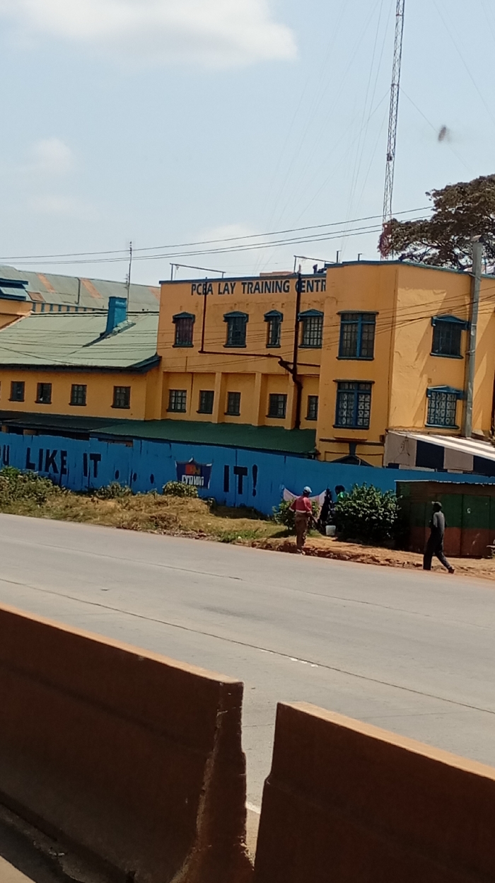 The image displays an outdoor urban environment in Sigona ward, Kenya, under a clear sky with scattered clouds. In the foreground, two brown concrete barriers are partially visible. Beyond these barriers, an asphalt road with faint lane markings extends horizontally across the frame. In the midground, a dirt verge with sparse dry vegetation separates the road from a blue barrier, possibly a corrugated fence or wall. This blue barrier exhibits white text, including "U LIKE IT" on the left and "IT!" on the right. Three individuals are present near this barrier. One individual, wearing a dark shirt and trousers, is walking right to left on the dirt verge. Another individual, dressed in a red shirt, dark trousers, and a light blue cap, stands facing the blue barrier, near what appears to be laundry on a line and a white bucket. A third person is partially visible behind the second individual, near a cluster of green bushes. To the far right, a small structure with dark green and brown sections is partially visible. The background is dominated by a multi-story building painted yellow or ochre, featuring numerous windows with dark blue/green frames. The building's upper facade bears the inscription "PCBA LAY TRAINING CENTR." To the left of this main building, another structure with a dark green corrugated roof and yellow walls is visible. Power lines traverse the upper portion of the scene, and a tall, slender metal lattice tower stands prominently on the right side of the frame, extending towards the sky.