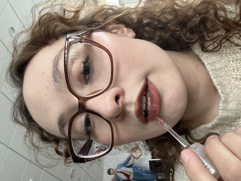 A female subject with light skin and curly brown hair, wearing brown-framed eyeglasses and a light-colored knit sweater, is depicted in a chest-up, close-range view. She is applying a reddish-brown liquid lip product to her slightly parted lips using an applicator held in her right hand. Her eyes are open, visible through the eyeglass lenses, with visible eyelashes. The background, partially obscured by the subject, reveals an indoor environment. Reflected in her eyeglasses and directly visible behind her is a large, colorful graphic or mural. This mural prominently features a stylized male figure in a blue suit, white shirt, and red tie, holding an orange object. This specific graphic is identifiable as Professor Moriarty from a mural series at the **Nagatinskaya station of the Moscow Metro, Moscow, Russia.** The ceiling above consists of white acoustic tiles with integrated linear lighting fixtures.