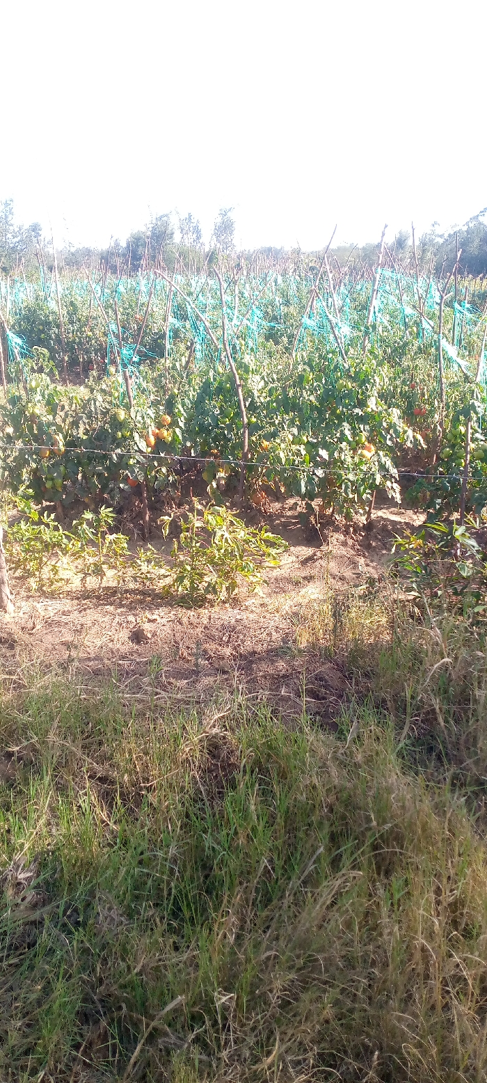 An agricultural scene features rows of staked tomato plants, some bearing ripe, orange fruit. A supporting blue trellis is visible. In the foreground, uncultivated land with dry grass and sparse vegetation transitions to tilled soil between rows. The background shows a continuation of the tomato crop under a bright, slightly washed-out sky.