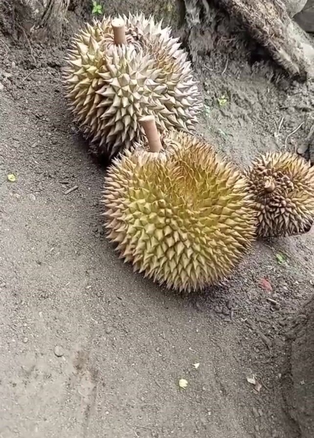 three spiky durian fruits on the ground next to a tree root
