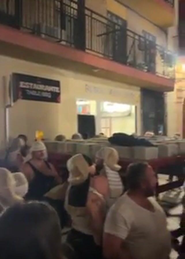 crowd of people gathered outside on a street at night. Many of the people in the foreground are wearing white hoods or cloths over their heads and faces. Some have striped cloths around their necks. Most of the crowd appears to be made up of men. The camera moves slightly, showing more of the crowd and the buildings behind them. There is a sign for a restaurant called "Restaurante Table BBQ" visible on one of the buildings. Some people in the crowd are talking, and their voices can be heard.