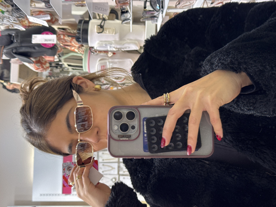 A woman is holding her phone in front of her face, taking a selfie in a mirror. She is wearing sunglasses and a black fuzzy jacket. Her hair is pulled back in a ponytail. A gold earring is visible. Her nails are painted red. The back of her phone has a black and gray attachment. Behind her, shelves display purses and eyewear.