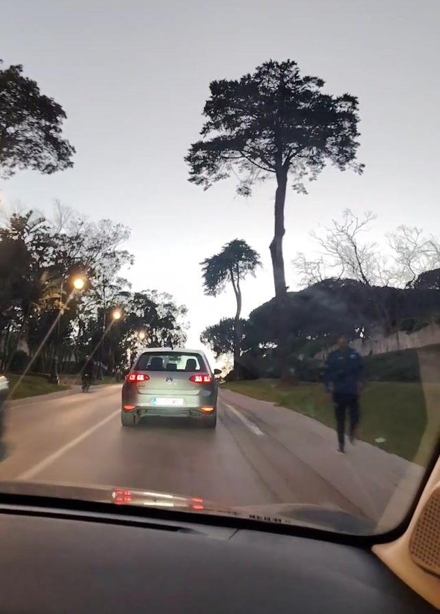 The video, filmed from the dashboard of a moving car, shows a road at dusk