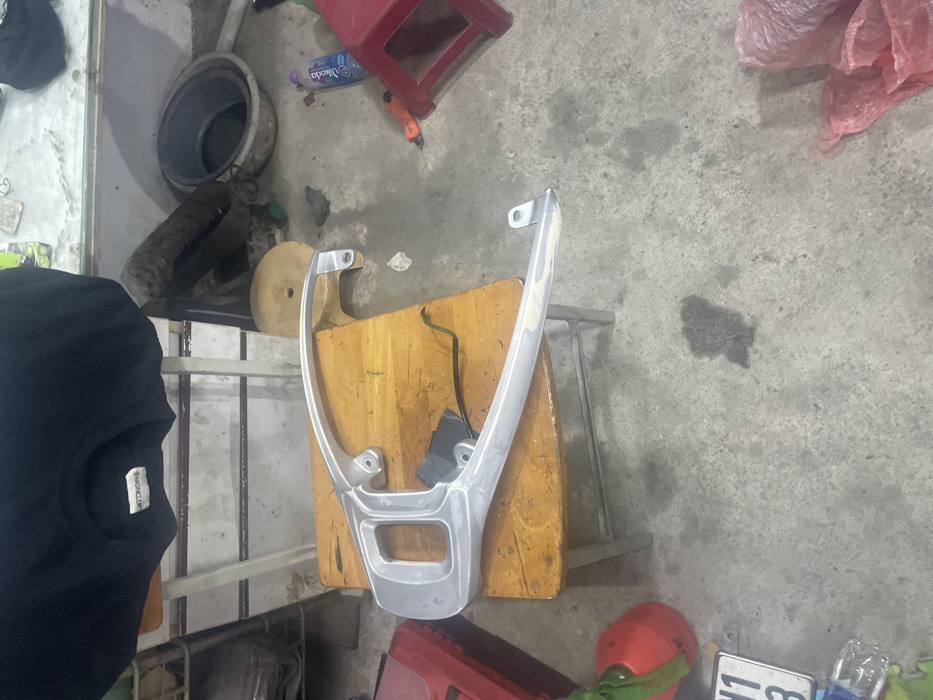 silver U-shaped motorcycle grab bar resting on a wooden surface. The grab bar has mounting points and a rectangular cutout in the center. Other items are visible, including a black t-shirt, a red container, a grinding wheel, and a chair. The scene appears to be in a workshop or garage, with a concrete floor.