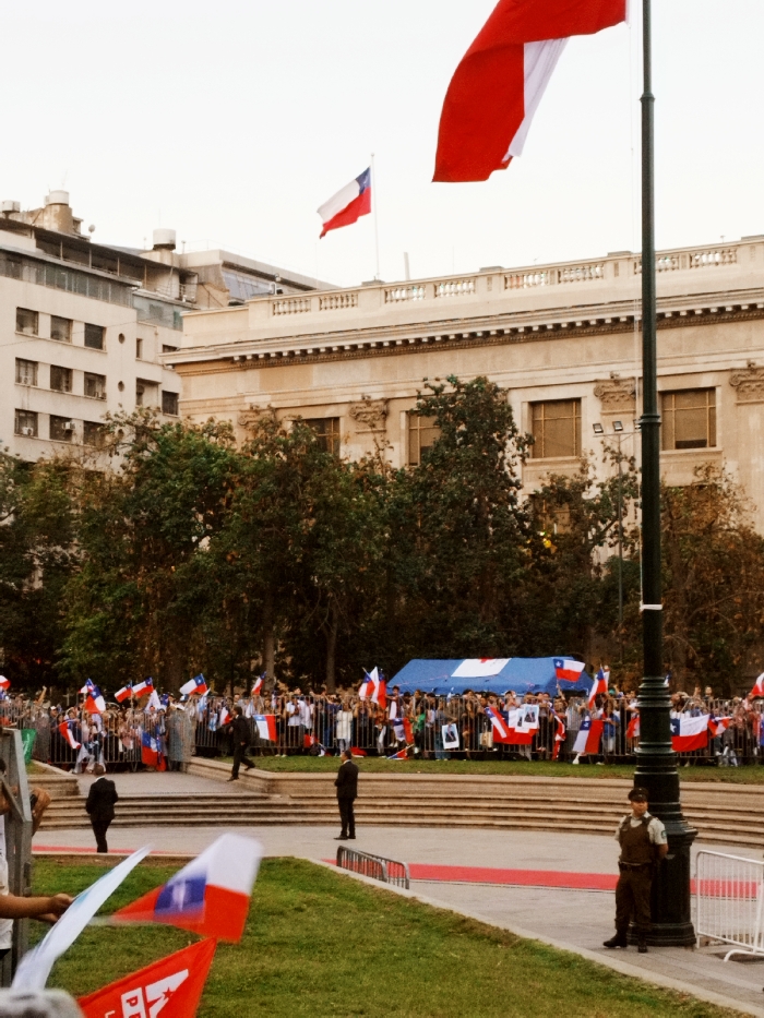 This image captures a public gathering in front of La Moneda Palace in Santiago, Chile