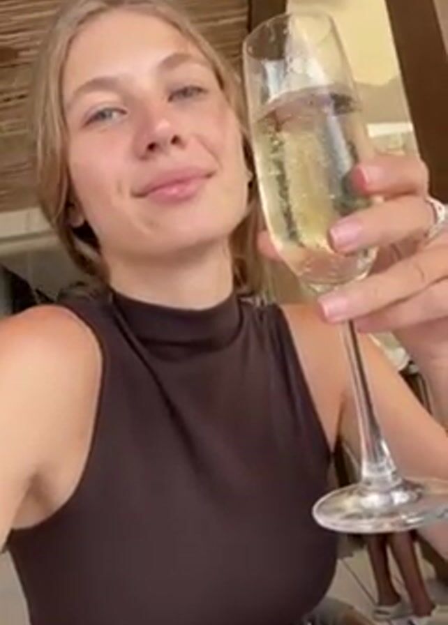 A woman is holding a glass of sparkling wine in front of her face. She has blonde hair and is wearing a brown sleeveless top. She is looking at the camera and smiling. There is a thatched roof above her and other people can be seen in the background. The camera zooms in on the glass of wine. The woman is sitting at a table.