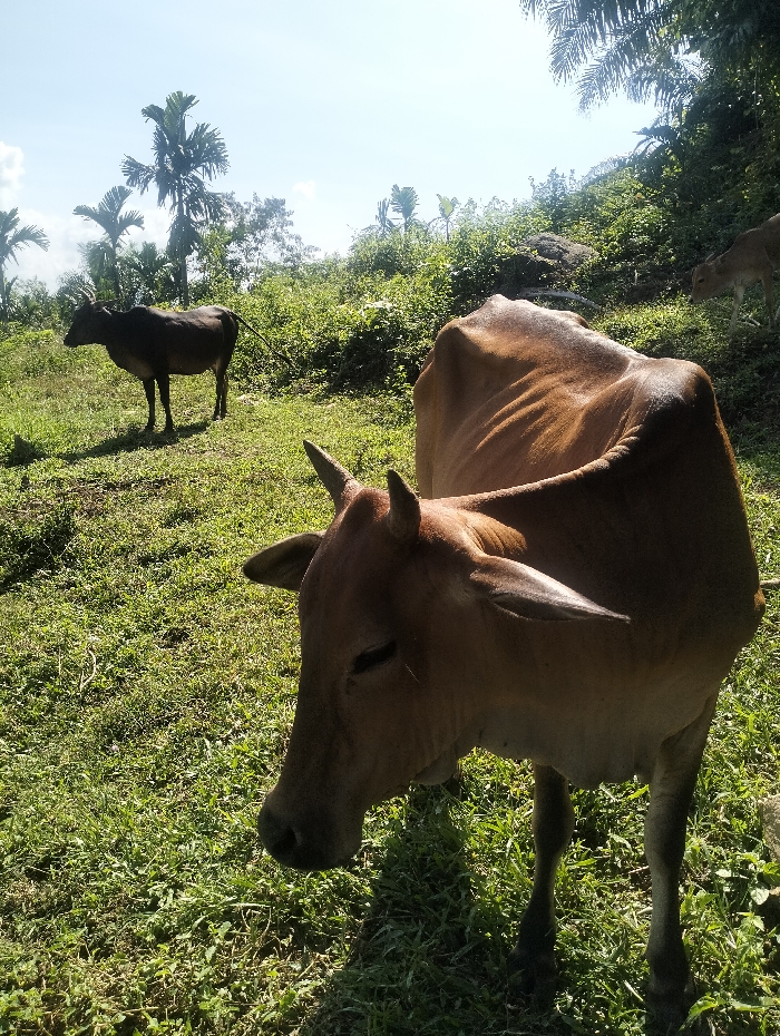 Three cows graze in a grassy, hilly landscape under a bright sky. One brown cow dominates the foreground, its head angled towards the ground. A dark cow stands in the midground, while only the rear of a third cow is visible on the right side. Palm trees dot the distant hillside. The scene is bathed in sunlight.