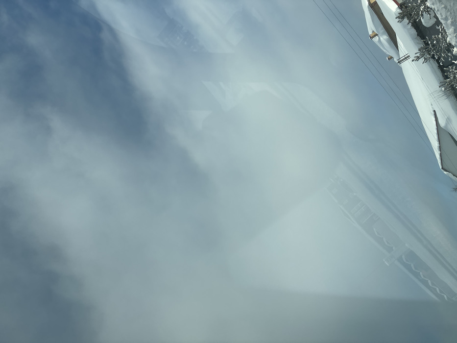 A hazy, overcast sky dominates the view, partially obscuring snow-covered structures. A building or structure with snow accumulation sits at the right edge, possibly a ski resort or residential building. Power lines traverse above the building. The overall atmosphere suggests a cold, snowy environment where visibility is limited by fog or heavy clouds. The scene has a muted, gray-blue color palette.