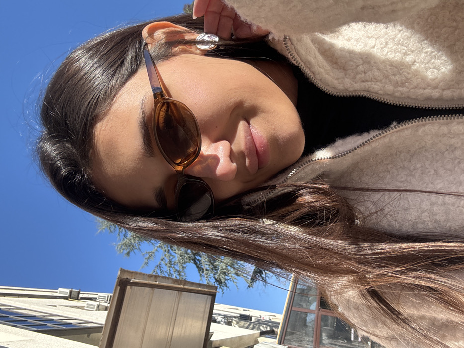 A young female subject is depicted in a close-up, brightly lit outdoor setting, identified as being in Šušanj, Montenegro. She has long, dark brown hair, parted on the side, falling over her left shoulder. She is wearing brown-tinted, oval-shaped sunglasses and a light-colored, possibly cream or beige, fluffy zip-up jacket over a black high-necked garment. A silver-toned zipper is visible down the front of her jacket. A silver-toned, textured circular earring is visible in her right ear. Her right hand is partially raised near her ear. The subject exhibits a slight smile. The background features a clear, bright blue sky. To the left and slightly behind the subject, a multi-story, light-colored building with multiple windows and several external air conditioning units is visible. Below this building, a light-colored rectangular structure, possibly an awning or sign, extends outwards. A tree with sparse green foliage is present in the mid-ground to the left. Strong natural sunlight illuminates the scene, casting highlights on the subject's hair and clothing.