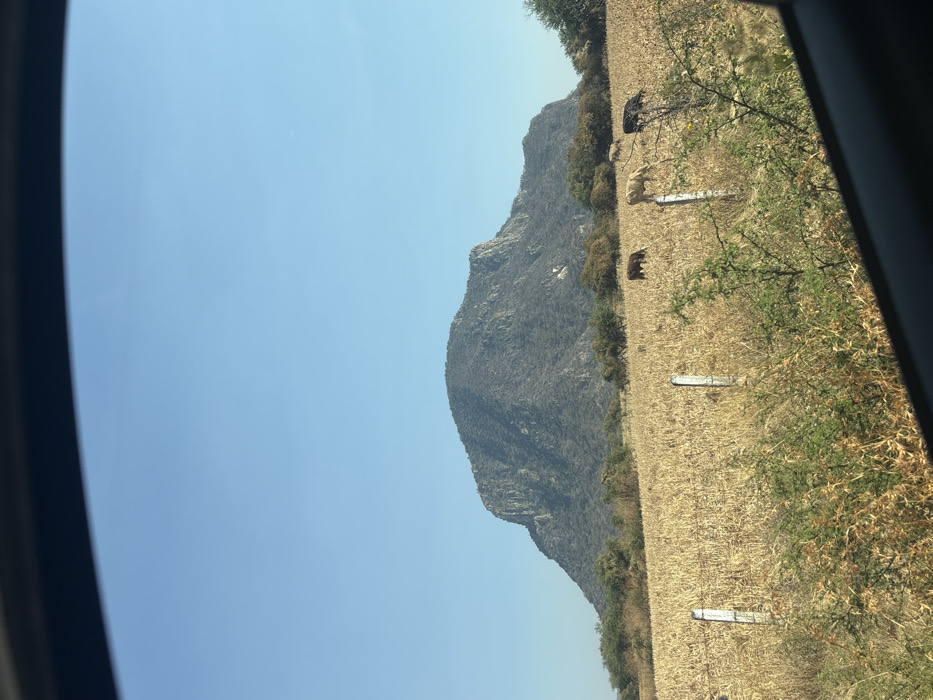 A landscape captured from a car window features a rugged mountain under a bright blue sky. Adjacent to the mountain is a field of dry, golden vegetation marked by sporadically placed, weathered posts. Patches of denser, green foliage provide contrast, adding depth to the scene observed through the frame of the car window.