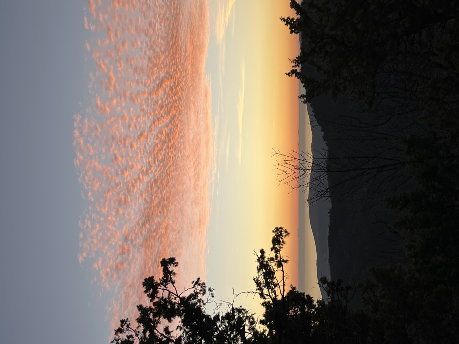 A landscape shot reveals a sunset. The sky is a blend of blue, fading into orange and yellow near the horizon. Altocumulus clouds are tinged pink. Silhouetted trees frame the bottom and right edges. A dark mountain range is visible between the horizon and the trees.
