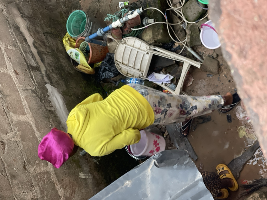 A person wearing a yellow shirt, floral pants, and sandals stands in a puddle amidst scattered debris. The clutter includes buckets, pipes, a broken chair, and various discarded items. The individual wears a pink head covering and yellow rubber gloves. The surrounding area appears to be a dirty, neglected outdoor space, likely an alleyway or drainage area, with a brick wall visible on one side.