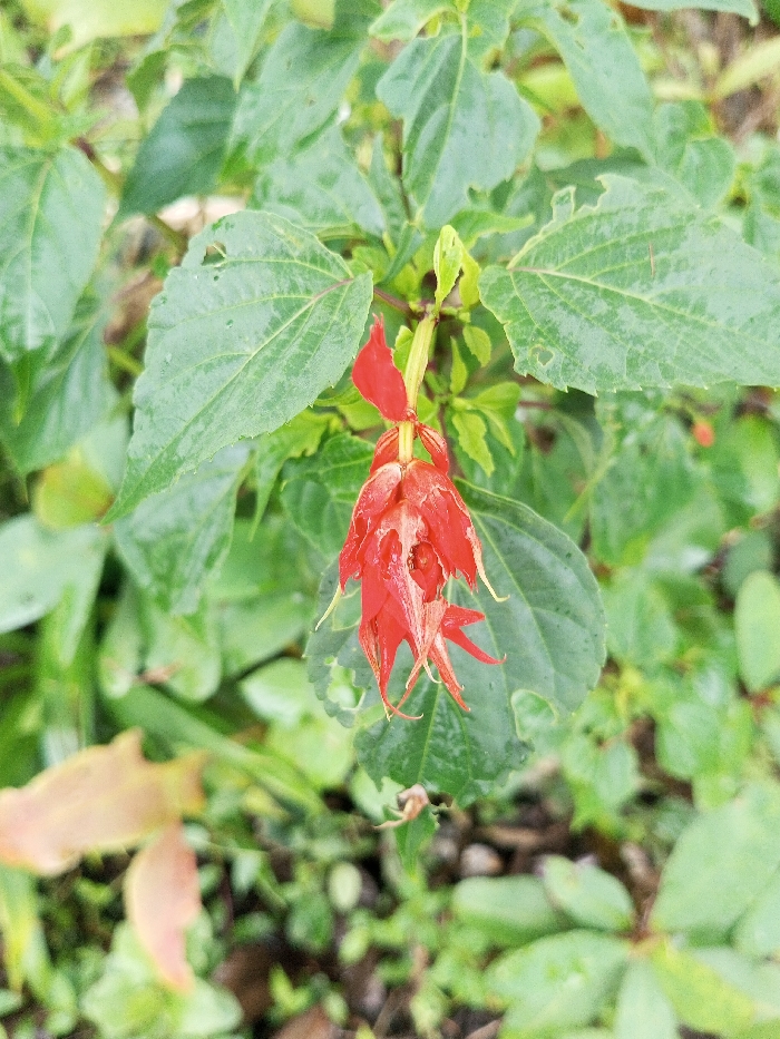 A close-up shot features a vibrant red flower, its petals cascading downwards in a cluster, surrounded by lush green foliage. The leaves are marked with tiny holes and glistening with moisture. The background is a blur of green, hinting at a dense garden or natural setting. The overall impression is one of natural beauty and vibrant color.