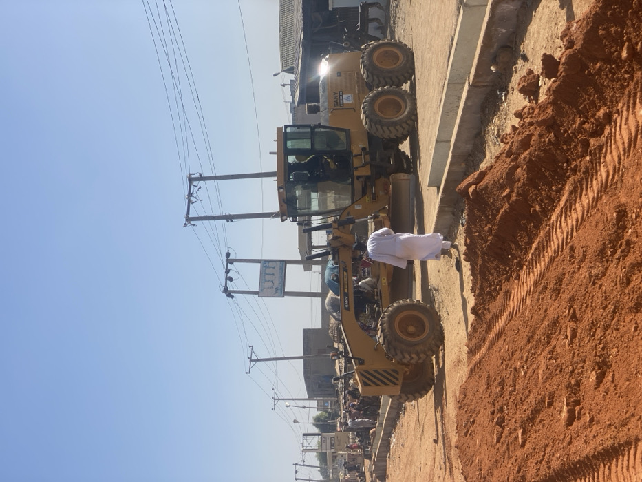 The image depicts an active road construction scene in Rijiyar Lemo, Nigeria, under a clear blue sky