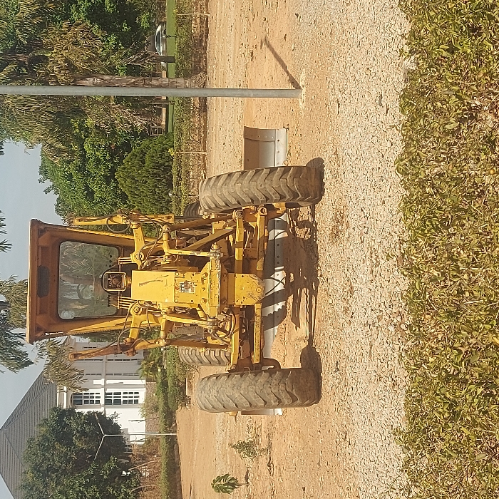 A yellow road grader sits on a gravelly surface next to a bush. It has a large, metal blade and four big, ridged tires. The vehicle's cab is visible with a steering wheel. A gray pole runs vertically through the image, casting a shadow. In the background, there's a white building with multiple windows and green trees. The scene is bathed in sunlight.