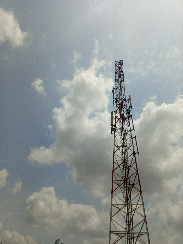 - "A tall, red and white lattice-structure telecommunications tower is positioned on the right side of the frame, extending vertically from the bottom edge, angled slightly upwards, and out of view at the top" by FM-f42e92, licensed under CC BY 4.0