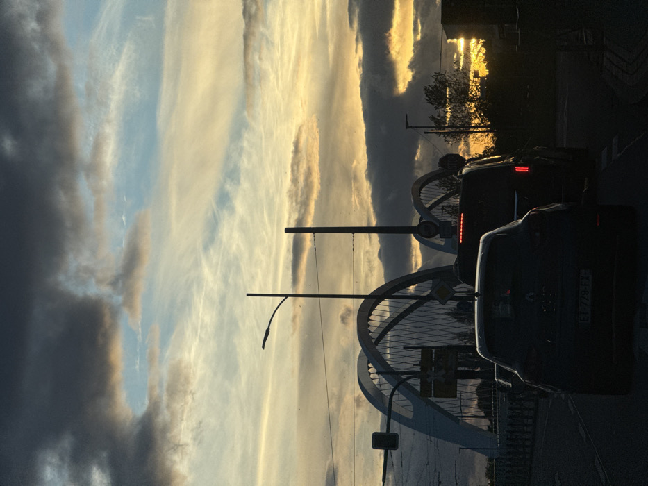 The image captures a roadway scene at dusk or dawn in Kehl, Germany, featuring the Europa Bridge. The sky above displays a gradient from deep orange-yellow on the right horizon, through pale blues, to dark grey clouds at the top and left, with wispy cirrus clouds interspersed. In the foreground, a dark-colored Renault hatchback, bearing license plate "FI-779-FX," is centered, facing away from the viewer on a dark asphalt road with white lane markings. To its right and slightly ahead, a dark minivan or SUV exhibits illuminated red brake lights. A third dark vehicle is partially visible further forward on the left. Tall, dark street light poles and traffic signal gantry structures are silhouetted against the sky, with one traffic light head visible on the far left. The Europa Bridge, characterized by its distinctive light-colored arch structures with dark diagonal support cables, spans the midground. Dark silhouettes of trees and bushes are visible on the right side of the road, partially obscuring the bright horizon. No individuals are discernible. The vehicles appear to be stationary or moving slowly, suggesting traffic congestion.