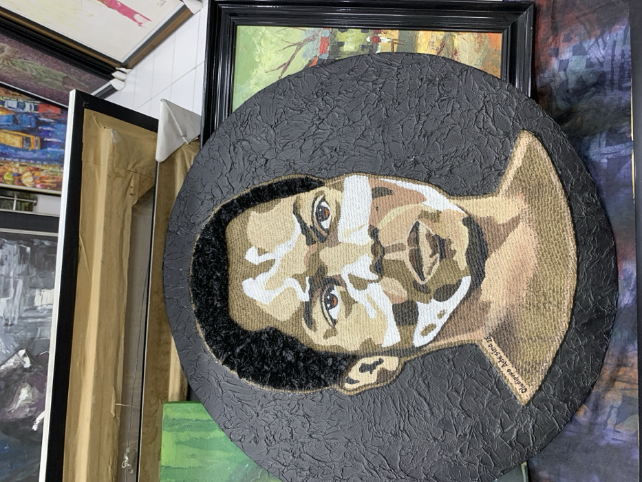 The image captures an indoor art display in Ikate, Nigeria. The central subject is a circular mixed-media portrait, approximately 60-70 cm in diameter, depicting the bust of a male figure. The figure has short, dark, textured hair and is rendered with varying shades of brown, white, and black against a dark gray, heavily textured background. The eyes are depicted in brown, and the mouth is slightly open. Inscribed in the lower left quadrant of the portrait are the words "Oladipupo Adesina 23" in white. The circular artwork rests on a dark, reflective surface, which shows faint reflections of other unseen objects below. Surrounding this central piece are multiple other framed artworks. To the immediate left, a portion of a green, abstract painting is visible. Directly behind and to the left of the central portrait, a large, dark-toned abstract painting in a black frame is partially visible. To the right of the central portrait, a black-framed landscape painting with green foliage and a building is present. In the upper background, several framed paintings are stacked or leaning, showcasing diverse styles including a vibrant street scene with cars and a lighter abstract composition. The floor in the upper right background consists of white tiles. The overall environment appears to be an art gallery, studio, or exhibition space. No individuals are present within the scene.