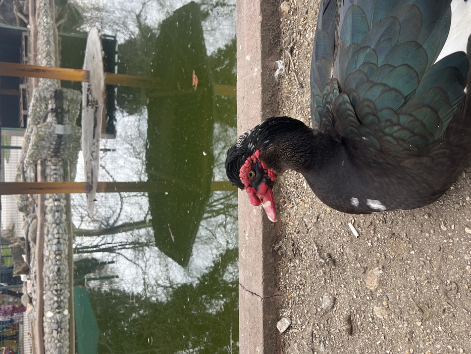 - "An adult Muscovy duck (Cairina moschata) with predominantly black iridescent plumage, distinct white flank markings, and a pronounced red carunculated face, is depicted resting on dry, light brown gravel in the foreground" by FM-j7WZt1, licensed under CC BY 4.0