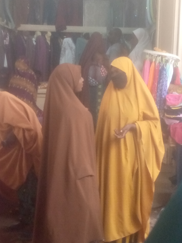 The image depicts an indoor scene within what appears to be a market or retail shop in Gombe, Nigeria