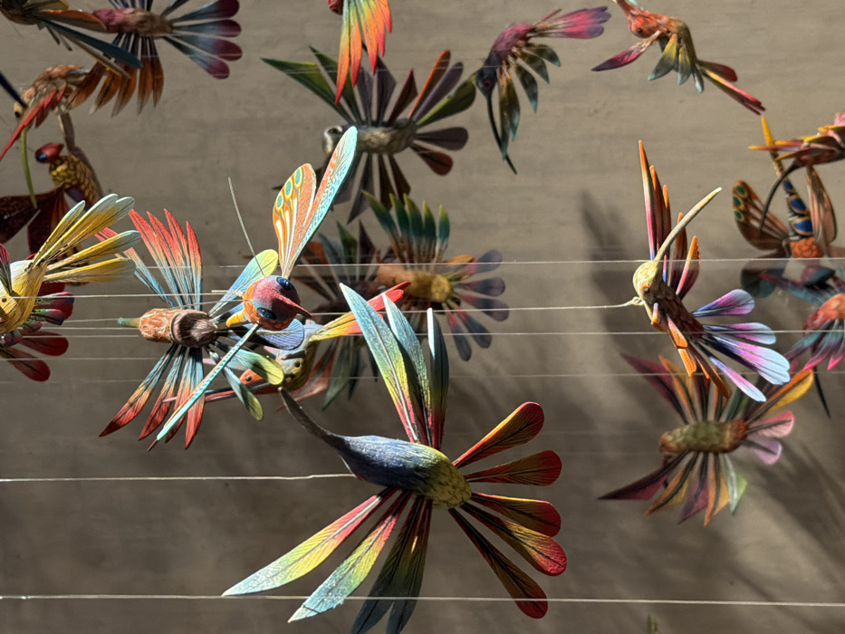 - "A collection of brightly colored, intricately carved wooden hummingbird figures are suspended from thin horizontal strings against a neutral-toned background" by FM-TOA2r1, licensed under CC BY 4.0