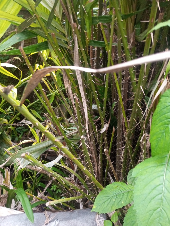 Location: Tecuci, Romania. The scene depicts a dense cluster of thorny plant stems in an outdoor environment. Numerous slender, greenish-brown stems, approximately 1-2 centimeters in diameter, are visible, many covered with sharp, light-colored thorns protruding perpendicularly from their surfaces. These stems are oriented vertically and are densely packed, obscuring the background. Various types of foliage are interspersed with the thorny stems. Some leaves are long and strap-like, displaying shades of green and yellowish-green. In the lower right foreground, a broader, ovate leaf with a distinct vein pattern is visible, appearing a vibrant green. Other leaves in the background are darker green, with some dried, brown foliage present. A horizontally oriented, dull grey, textured object, possibly concrete or stone, extends across the lower portion of the image. The lighting is ambient, without strong directional shadows. No individuals, animals, or man-made structures other than the grey object are present.