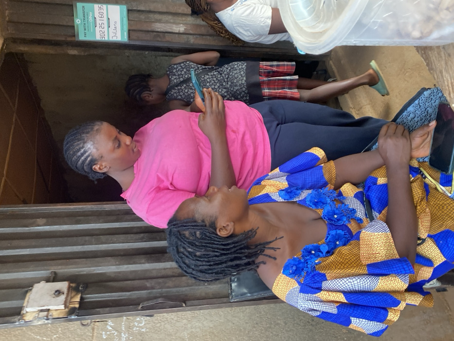 Three women are indoors. Two are close together, appearing to share a phone. One wears a pink top and black pants, while the other is in a blue and yellow patterned dress. A third woman in a dark dress with red plaid accents lies in the background. A sign is visible above them. The setting seems to be a storefront with a corrugated metal exterior.