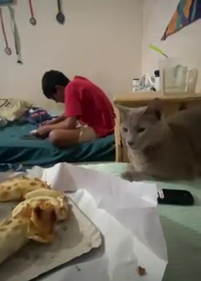 A medium shot of a room. In the foreground is a paper plate of what appears to be empanadas. In the background, a young person in a red shirt is kneeling on a bed and writing or drawing on a notebook. To the right, a light gray cat is lying on a wooden nightstand, looking toward the empanadas. The room appears to be a bedroom; hanging on the wall behind the bed are several decorative items. The walls are painted white.