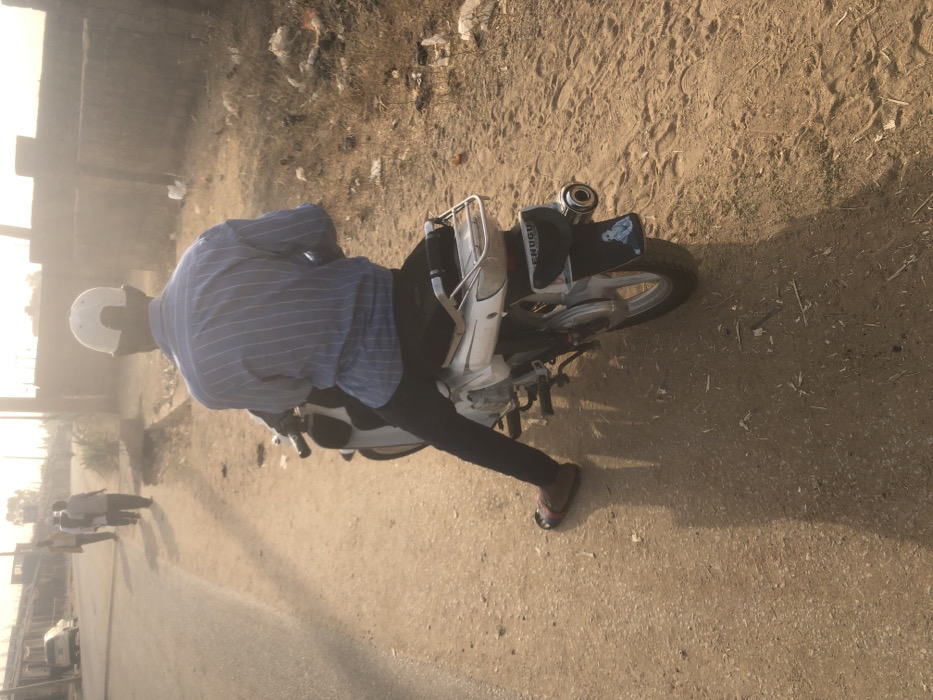 A man sits on a white motorcycle wearing a striped blue shirt, dark pants, sandals, and a white helmet. The motorcycle has a rear cargo rack, and a "ENUGU" covering on the back. The scene is dusty, with trash in the background and an arid environment. In the distance, people walk near buildings. The light is bright, causing a washed-out effect.