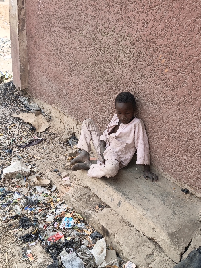 A child is depicted sitting on a two-tiered concrete ledge against a reddish-brown, textured stucco wall in the city of Dakata, Nigeria. The child wears a light-colored, long-sleeved, one-piece garment, which is visibly soiled and tattered, particularly around the chest and knees. The child's skin is dark, and the hair is short and dark. The child is barefoot, with hands resting on the concrete surface in front. The head is bowed, directing the gaze downwards. The ground in front of the child and extending to the left is heavily covered with an accumulation of diverse refuse, including plastic bags, cardboard, paper, and various discarded items. A single light-colored sandal is partially visible amidst the debris to the left of the child's feet. The immediate surroundings are unkempt, with sandy, dusty ground visible beyond the litter, suggesting an outdoor, neglected area.