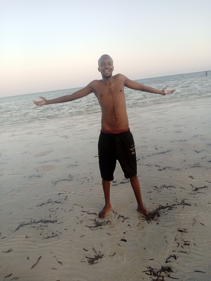A male individual stands on a sandy beach in Shanzu ward, Kenya