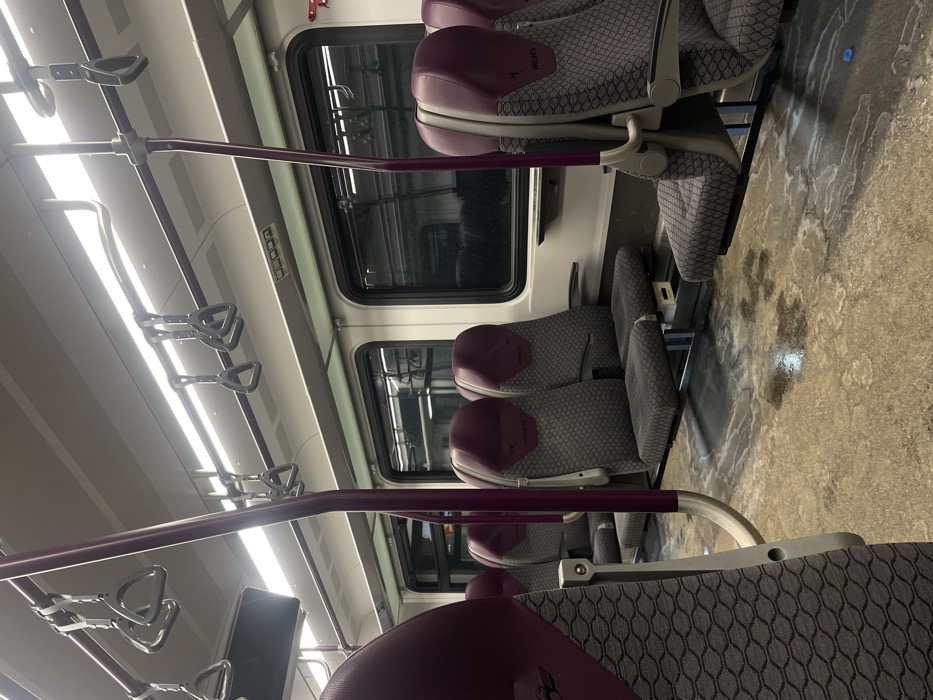 - "Inside a train car, rows of patterned seats in shades of gray and purple face the viewer" by FM-igmhG3, licensed under CC BY 4.0